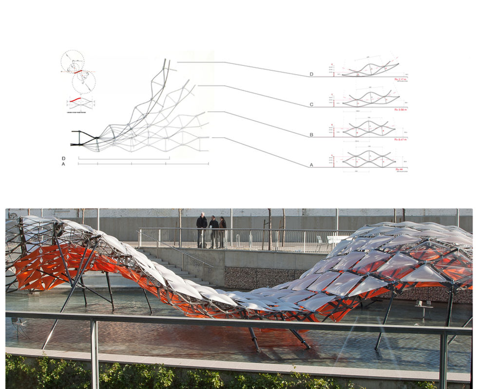 El producte. Les estructures arquitectòniques lleugeres tenen aplicacions a gran i petita escala. A gran escala es poden utilitzar com cobertes, pannells i passarel·les de recintes firals, estadis i naus industrials; o com a elements de façana en edificis d’avantguarda (el Guggenheim a Bilbao és l’edifici més representatiu). A petita escala es poden utilitzar com a carpes o pèrgoles. Una altre aplicació molt interessant per a l’estructura HYPERMEMBRANE és per realitzar estructures per encofrats per formigó. Actualment el cost econòmic de les estructures que s’utilitzen per realitzar encofrats de formes no estàndards és moltes vegades més alt que la pròpia estructura final de formigó armat. El fet de ser un sistema de geometria variable i desmuntable, obre un gran expectativa en el mercat pel fet de poder tenir diferents formes geomètricament complexes partint d’una producció estandaritzada.